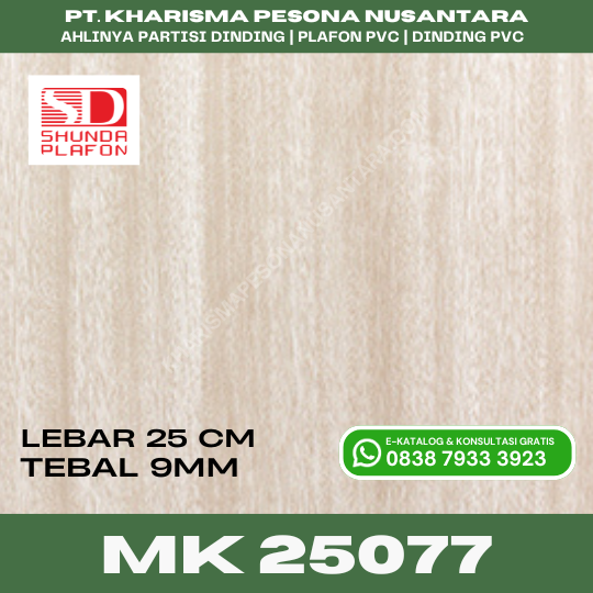 Pastikan keindahan hunian Anda terjaga dengan menggunakan produk Shunda Plafon original seri MK 25077. Kami menjamin kualitas material yang tidak mudah pecah (getas) dan warna yang tahan lama. Hubungi admin kami sekarang untuk informasi stok terbaru, pilihan panjang batang yang tersedia, serta konsultasi perhitungan kebutuhan material agar sesuai dengan budget dan dimensi ruangan Anda.