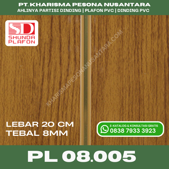 Keunggulan utama dari seri PL 08 005 ini adalah kemudahan dalam pemeliharaan. Permukaannya yang halus mencegah debu menempel secara berlebih, sehingga Anda cukup membersihkannya sesekali dengan kain lap basah untuk menjaga tampilannya tetap seperti baru. Bobotnya yang ringan namun solid juga sangat mempermudah proses pemasangan, sehingga pengerjaan proyek renovasi Anda menjadi jauh lebih cepat dan efisien dibandingkan menggunakan plafon konvensional.